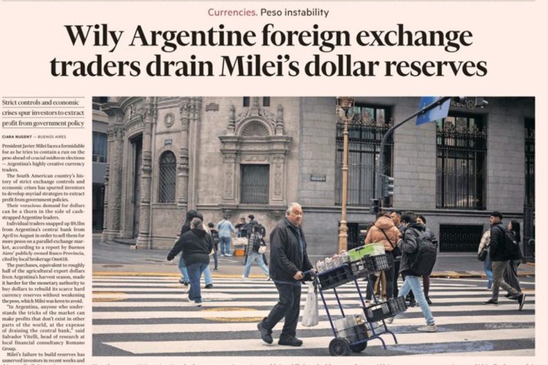 El Financial Times, en tanto, imprimió en su edición de papel una nota sobre cómo operadores financieros drenan los dólares que Caputo vende a precio promocional. "Los astutos operadores de divisas argentinos agotan las reservas de dólares de Milei", tituló el influyente periódico.