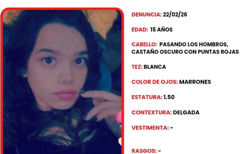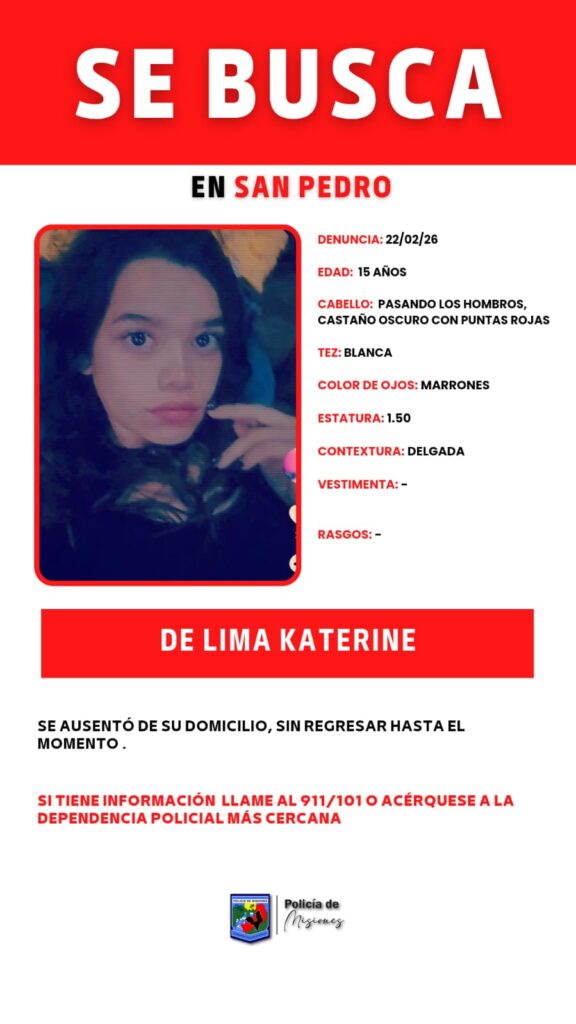 Adolescente desaparecida en San Pedro 22 febrero, 202622 febrero, 2026 De Lima Katerine se ausentó de su domicilio sin regresar hasta el momento, cualquier información comunicarse con la seccional policial más cercana.