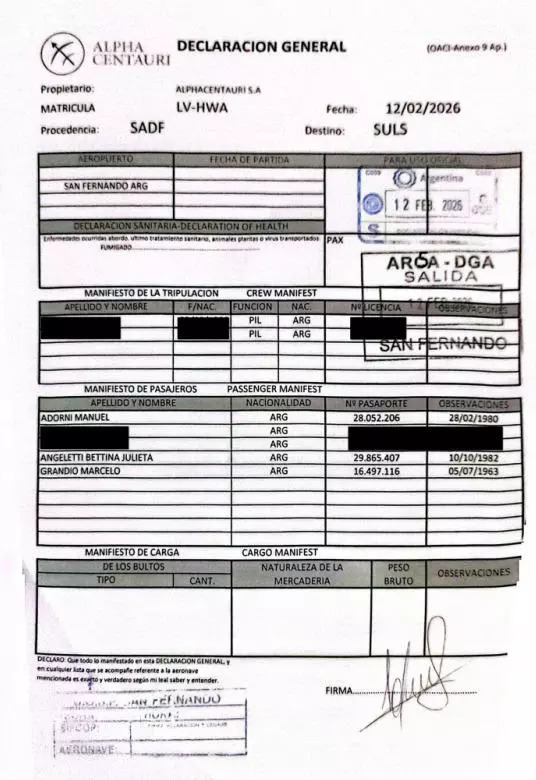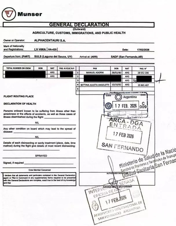 La partida a las 20.21 del jueves 12 de febrero fue desde el aeropuerto de San Fernando, norte del Gran Buenos Aires, con llegada a Laguna del Sauce, Punta del Este, a las 20.56, según la documentación. Los pasajeros transportados fueron Adorni, Angeletti, dos integrantes de la familia y Grandio, conductor del programa “Giros” en la TV Pública y allegado al jefe de Gabinete antes de la asunción de Javier Milei en Casa Rosada.