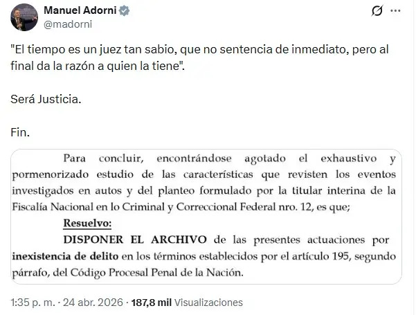 El primero en reaccionar fue Adorni, quien citó parte del fallo y publicó una contundente frase: "El tiempo es un juez tan sabio, que no sentencia de inmediato, pero al final da la razón a quien la tiene".