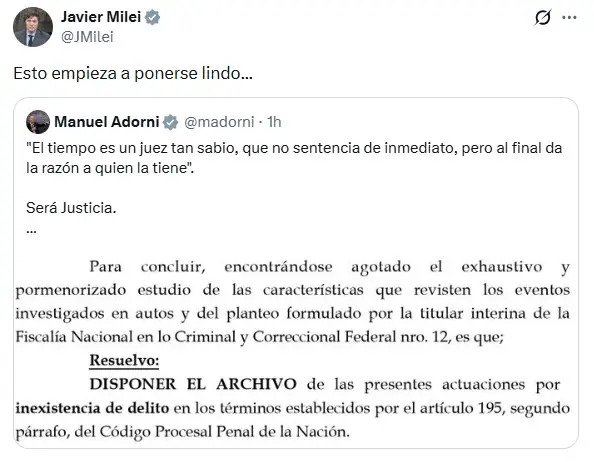 Javier Milei y el propio Manuel Adorni celebraron en redes sociales el fallo del juez Daniel Rafecas, que ordenó archivar la investigación por el viaje de la esposa del Jefe de Gabinete, Bettina Angeletti, a Nueva York en el avión presidencial.