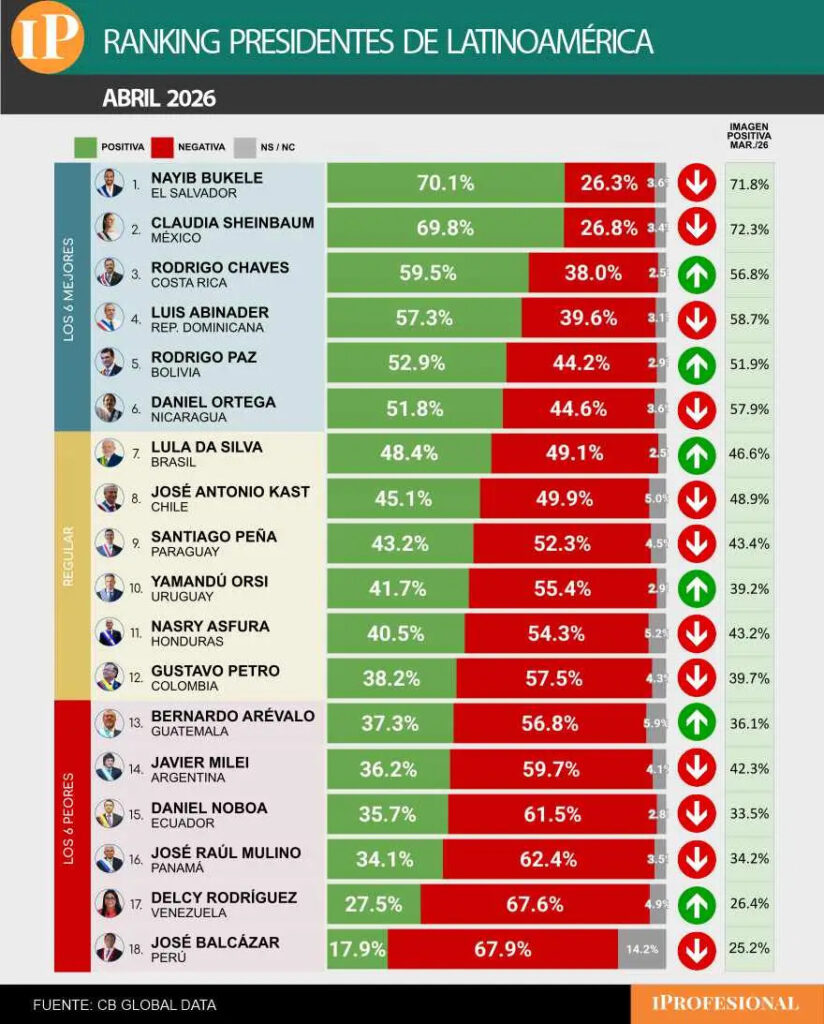 En cambio, en abril Milei fue superado por sus pares sudamericanos Rodrigo Paz (Bolivia), que ocupó el quinto puesto y apareció entre "los 6 mejores" con 52,9%; Lula Da Silva con 48,4%; el chileno José Antonio Cast con 45,1%; el paraguayo Peña con 43,2%; el uruguayo Orsi con 41,7% y el colombiano Gustavo Petro con 38,2%, ubicados en las posiciones 7,8,9,10 y 12, respectivamente.