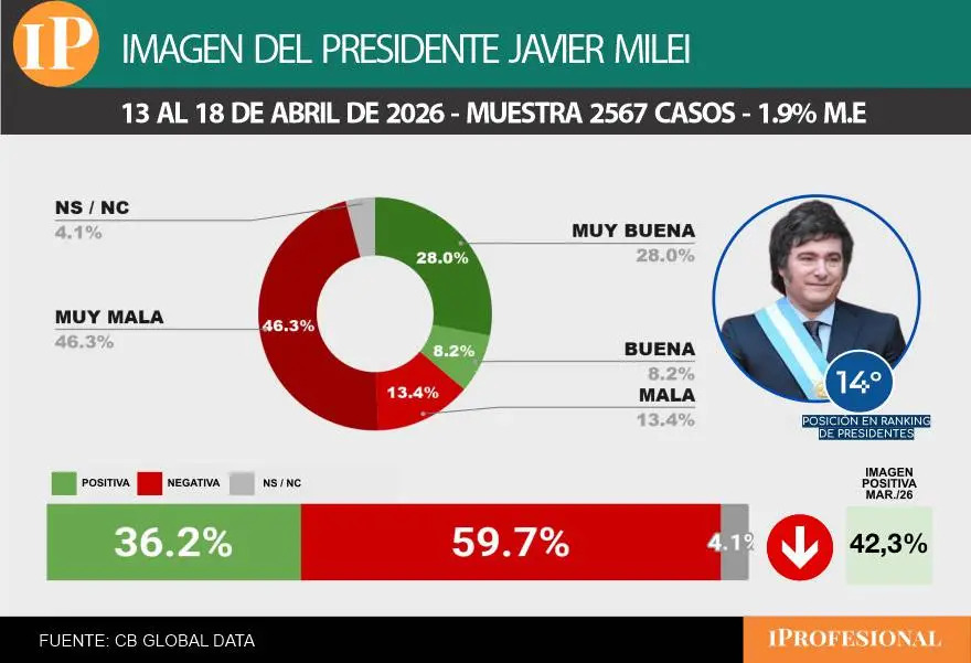 CB Global Data midió la imagen de los 18 presidentes de América Latina entre el 13 y el 18 de abril y en el caso de Argentina, la encuesta tomó 2.567 casos, con un margen de error 1,9%. Milei cosechó una aceptación de 36,2% contra un rechazo de 59,7%.