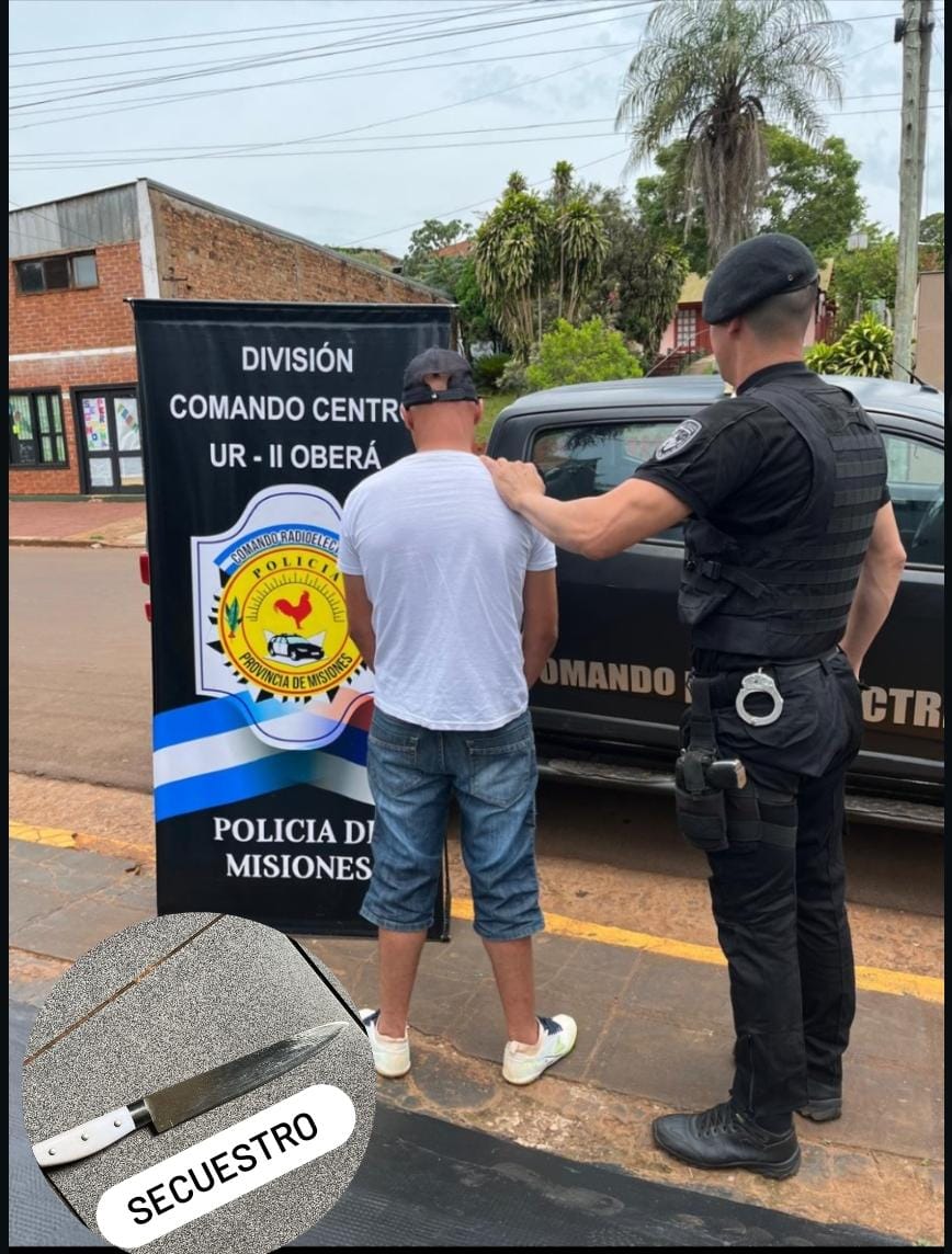 En la tarde del domingo en Oberá, efectivos de la División Comando Radioeléctrico Zona Centro detuvieron a un hombre de 27 años acusado de amenazar a su pareja con un cuchillo tipo carnicero, tras una denuncia radicada días atrás. En el procedimiento, además, secuestraron el arma presuntamente utilizada.