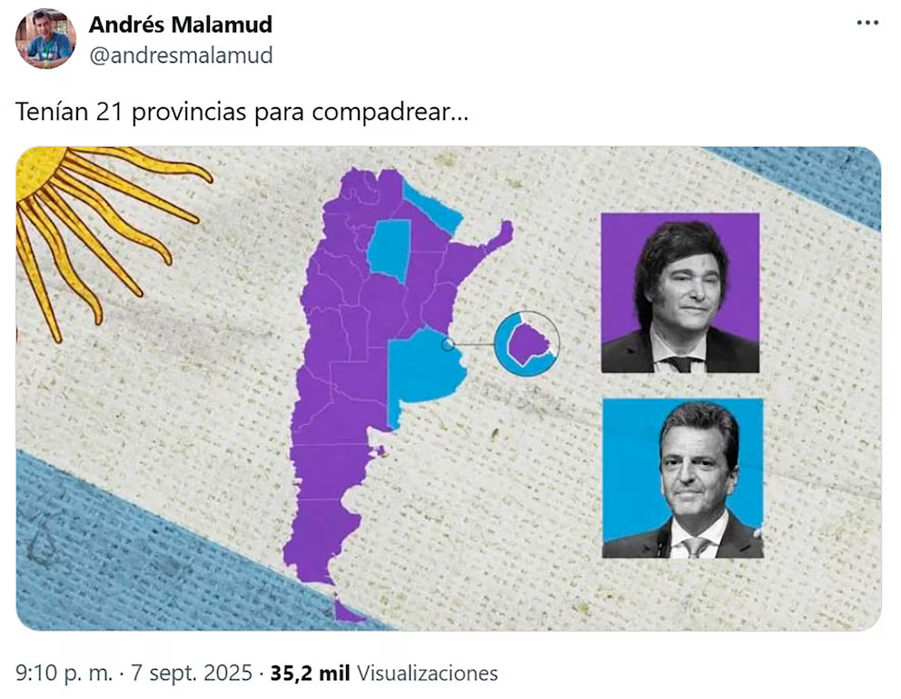 Además, Malamud mencionó como explicación que el desdoblamiento del calendario electoral y la “seccionalización” de los comicios dispuesta por el gobernador Axel Kicillof terminó favoreciendo al peronismo. “No hubo lista provincial, una lista con un león violeta que se supiera que era Milei”, subrayó. El politólogo, de pertenencia en la Unión Cívica Radical (UCR), dijo que por el tipo de elección “era muy difícil traducir la imagen positiva supuesta (de Milei) en un voto, porque tenía 135 intendentes luchando por sus concejales”.