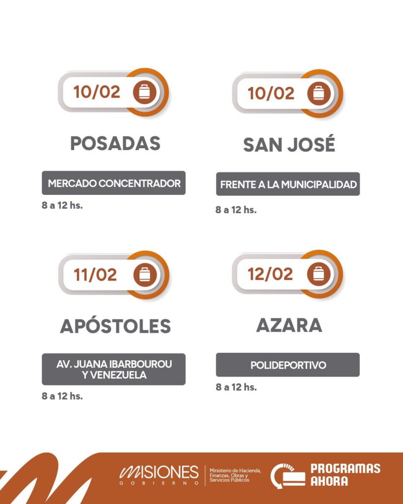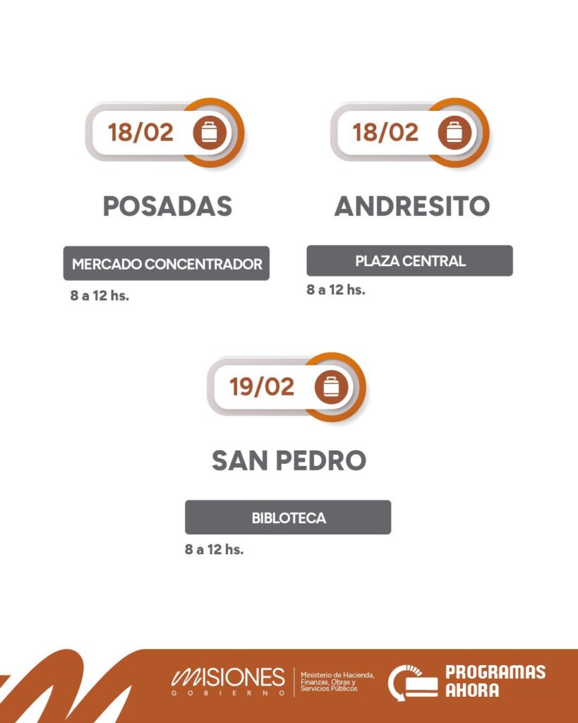 Durante febrero el operativo estará funcionando en el Mercado Concentrador de Posadas los días martes 3, 10 y 24 de febrero; y miércoles 18 de febrero. En Garupá (miércoles 4/2), San José (martes 10/2), Apóstoles (miércoles 11/2), Azara (jueves 12/2), Concepción de la Sierra (jueves 5/2), Andresito (miércoles 18/2), San Pedro (jueves 19/2), Puerto Esperanza (martes 24/2), Wanda (miércoles 25/2) y Puerto Libertad (jueves 26/2).