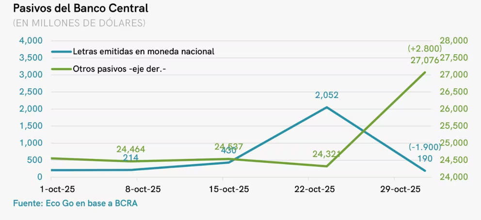 El balance del BCRA publicado este miércoles reflejó una caída en las letras emitidas en moneda local por el equivalente a USD 1.900 millones, según datos relevados por la consultora Eco Go al 31 de octubre. Esta cifra coincide con los fondos que habría utilizado Bessent previo a los comicios. Sin embargo, el rubro “otros pasivos”, donde se registran las operaciones de swap, aumentó en USD 2.800 millones. Al respecto, Eco Go explicó: “Lo más probable es que la diferencia se explique por el último pago de intereses al FMI del año”. En el mismo sentido, el BCRA informó que este miércoles se realizó un pago por USD 796 millones al organismo.