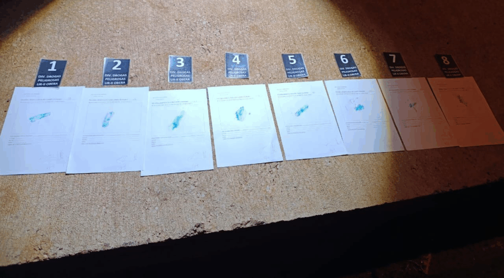 Posteriormente, al ser identificada como Valeria F. (27), los efectivos constataron que dejó caer un envoltorio celeste con sustancia compatible con cocaína sobre la cinta asfáltica. Al avanzar con la requisa, realizada en presencia de testigos, comprobaron que llevaba en su mano otros siete envoltorios iguales, completando un total de ocho dosis. Además, se incautaron 52.200 pesos argentinos en efectivo y un teléfono celular de la línea Redmi.