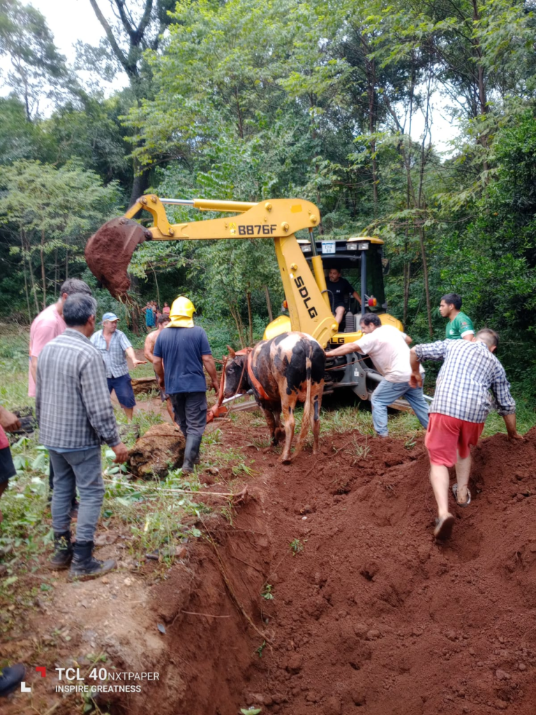 Ante esta situación, se solicitó la colaboración del municipio, que dispuso una retroexcavadora para ampliar el área de trabajo. Con esta herramienta y el esfuerzo conjunto de los efectivos, el propietario del animal y vecinos del barrio, finalmente se logró liberar al vacuno sin que presentara lesiones.
