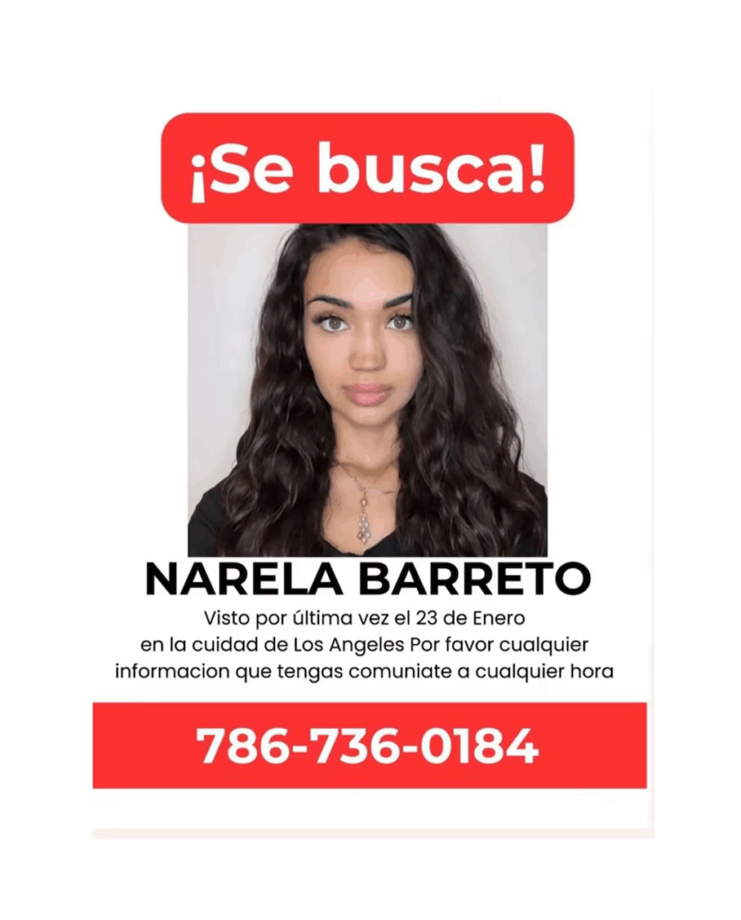 “¡Se busca! Narela Barreto. Vista por última vez el 23 de enero en la ciudad de Los Ángeles. Por favor, cualquier información que tengas, comunicate a cualquier hora al 786-736-0184”, indica el afiche de búsqueda que circula en redes sociales.