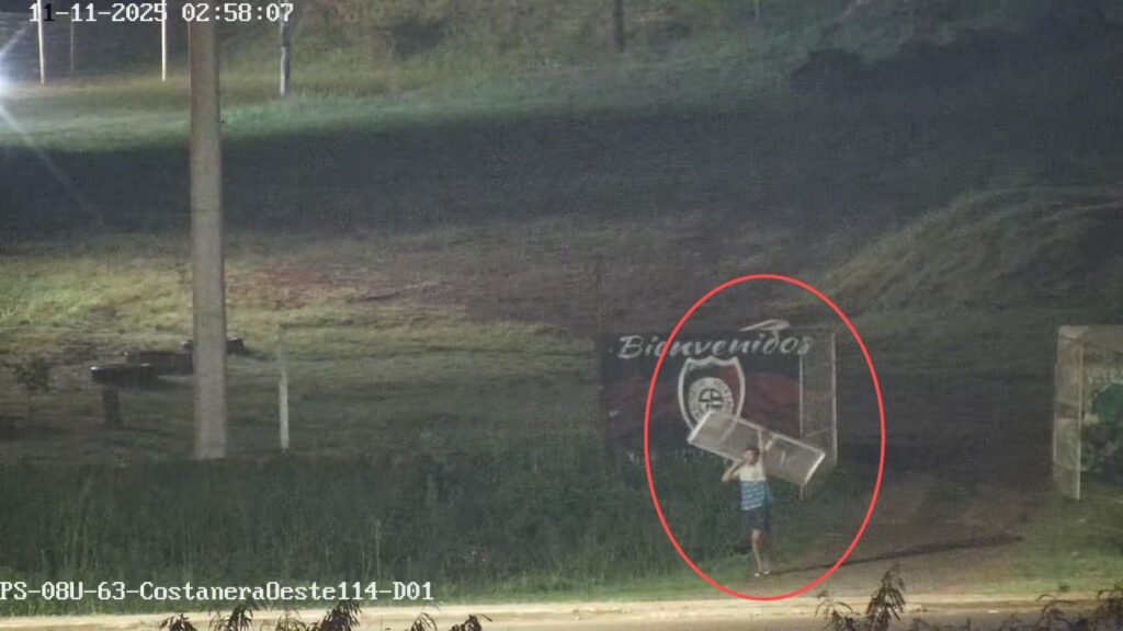 Minutos más tarde, a las 03:07, otra cámara ubicada en la intersección de avenidas Jauretche y Blas Parera captó a dos individuos forzando el portón de ingreso de un local comercial. La rápida coordinación entre el videovigilador y el Comando Zona Centro permitió la detención de Horacio Javier S. (44) y Alejandro Joaquín R. (28), alias “Fantasmita”, este último sorprendido con una barra metálica y otros elementos que usaba para violentar la puerta del negocio.