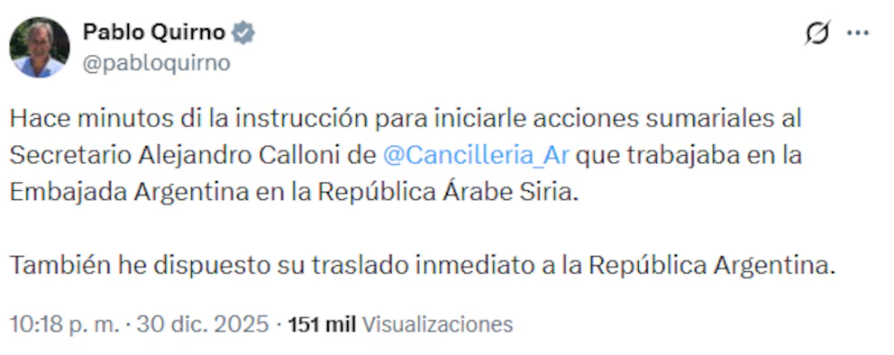 Durante la noche del martes, el canciller Pablo Quirno ordenó que Alejandro Calloni, un secretario de la Embajada Argentina en la República Árabe Siria, sea desplazado de su cargo y regresara al país. La sanción fue consecuencia de que el diplomático avalara ataques contra de Israe la través de sus redes sociales.