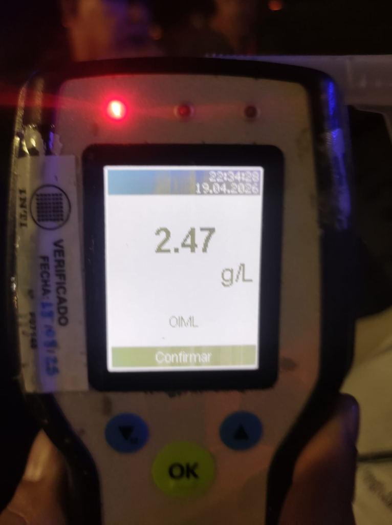 Posteriormente, intervino personal de la Dirección General de Seguridad Vial, que realizó el test de alcoholemia al conductor del Ford Ka, arrojando resultado positivo de 2,47 gramos de alcohol por litro de sangre. Ante esta situación, el hombre fue demorado, se labró el acta de infracción correspondiente, se procedió al secuestro de su licencia de conducir y el vehículo fue trasladado al depósito de resguardo.