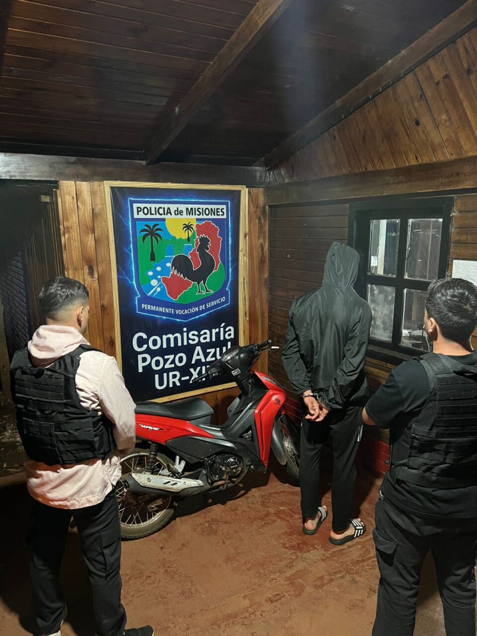 El detenido fue identificado como Lucas David D. M., de 20 años, domiciliado en Pozo Azul. Al verificar la motocicleta, una Honda Wave 110 cc, se estableció que posee pedido de secuestro vigente por una causa de robo en la provincia de Buenos Aires.