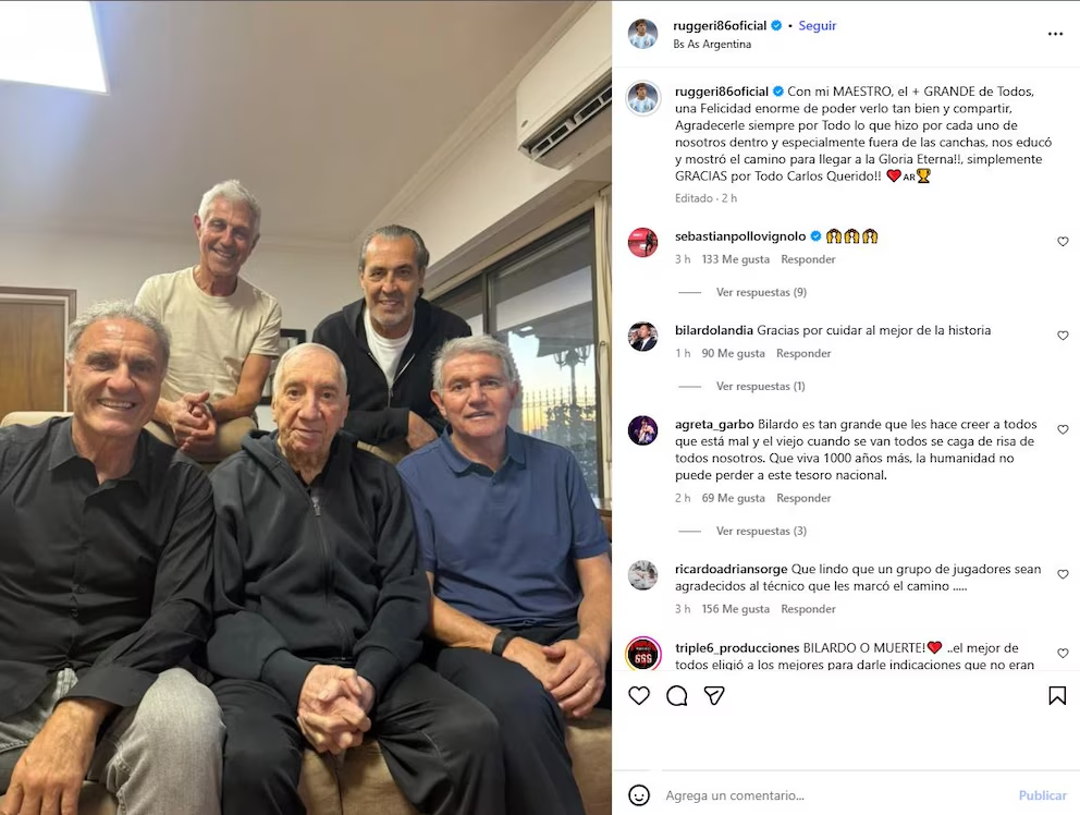 El encuentro, que tuvo lugar en el departamento donde Bilardo reside bajo cuidados médicos debido al síndrome de Hakim-Adams, fue documentado por Ruggeri a través de una publicación en Instagram. En la imagen, se observa al ex director técnico de la selección argentina acompañado por quienes fueron titulares en la final del Mundial de México 1986. La fotografía fue acompañada por un mensaje de profundo reconocimiento: “Con mi maestro, el más grande de todos. Una felicidad enorme poder verlo tan bien y compartir. Agradecerle siempre por todo lo que hizo por cada uno de nosotros dentro y especialmente fuera de las canchas. Nos educó y mostró el camino para llegar a la gloria eterna. Simplemente gracias por todo, Carlos querido”, escribió Oscar Ruggeri en su cuenta.