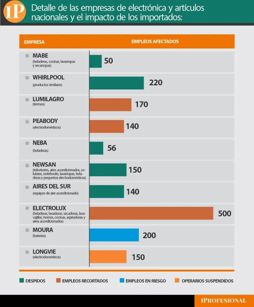 En el mercado de la electrónica, el reemplazo de lo producido en el país por lo generado fronteras hacia afuera explica la reducción de operarios en Electrolux, Whirlpool, Aires del Sur y Neba, entre otras firmas.