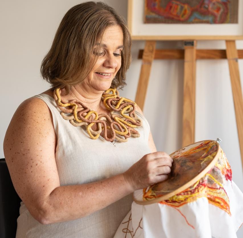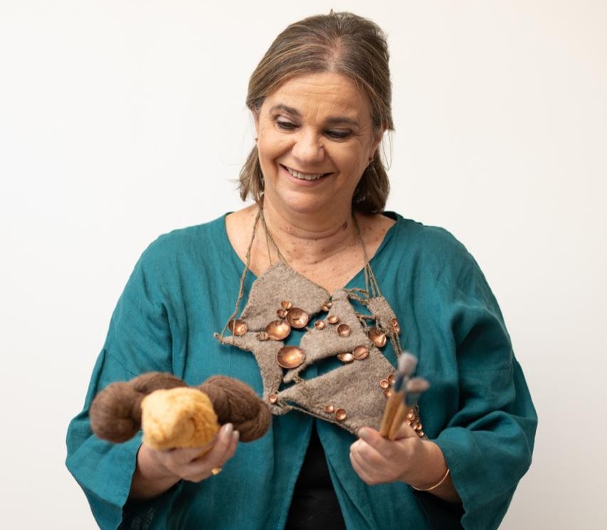 “Siempre tuve una pata creativa muy importante”, afirma la artista, quien colabora desde 2017 con el Centro Argentino de Arte Textil (CAAT), institución pionera en América Latina, con casi cincuenta años de trabajo ininterrumpido en la visibilización y promoción del arte textil.