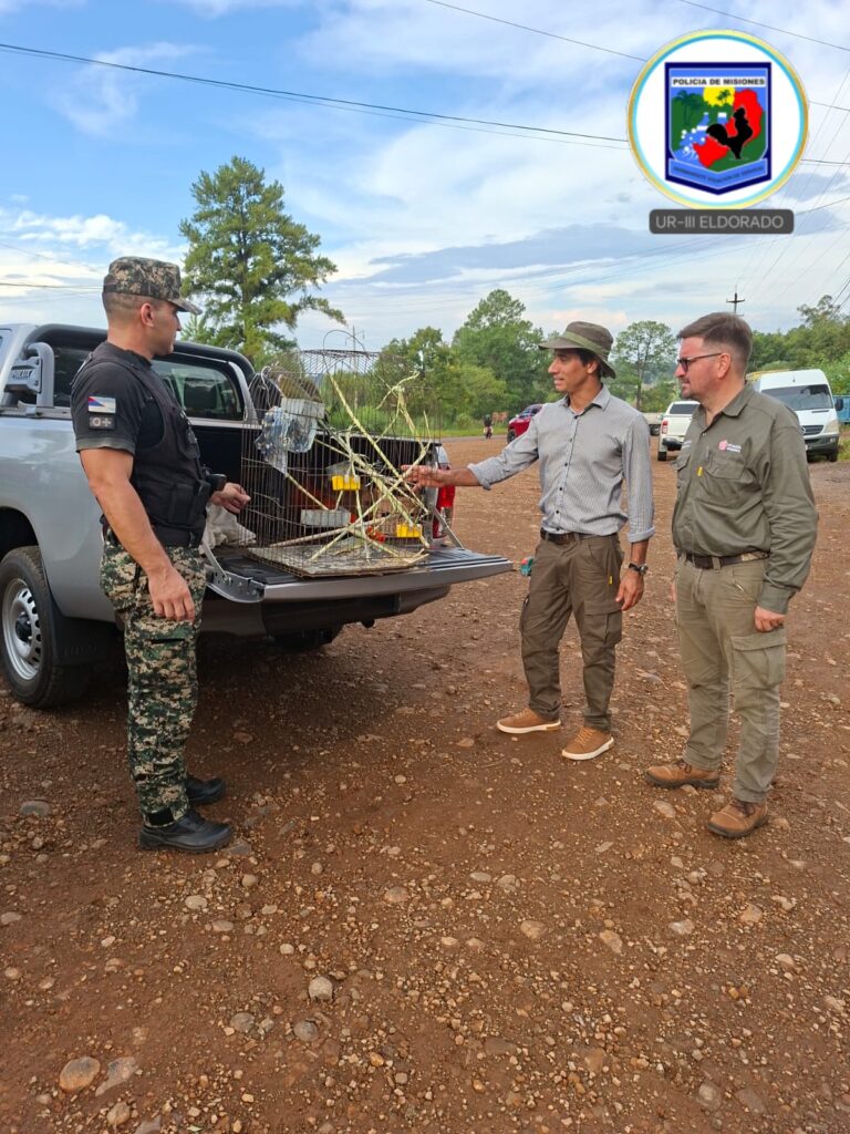 Posteriormente, en Eldorado, en inmediaciones de la avenida Fundador y la calle Matienzo, kilómetro 3, efectivos policiales rescataron dos ejemplares de loros silvestres. Las aves fueron puestas bajo resguardo y luego entregadas a personal del Ministerio de Ecología, quienes las trasladaron al Parque Ecológico El Puma para su protección y recuperación.