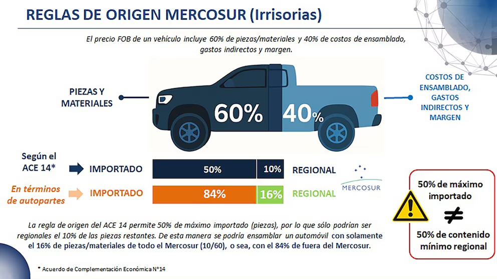 Dicho de otro modo, que el 50% del vehículo pueda ser de origen extranjero, quiere decir que solo el 10% del valor del auto sea local o regional. En porcentajes dentro del rubro autopartes, esa proporción es entonces de 84% importado y 16% de partes producidas en la región.