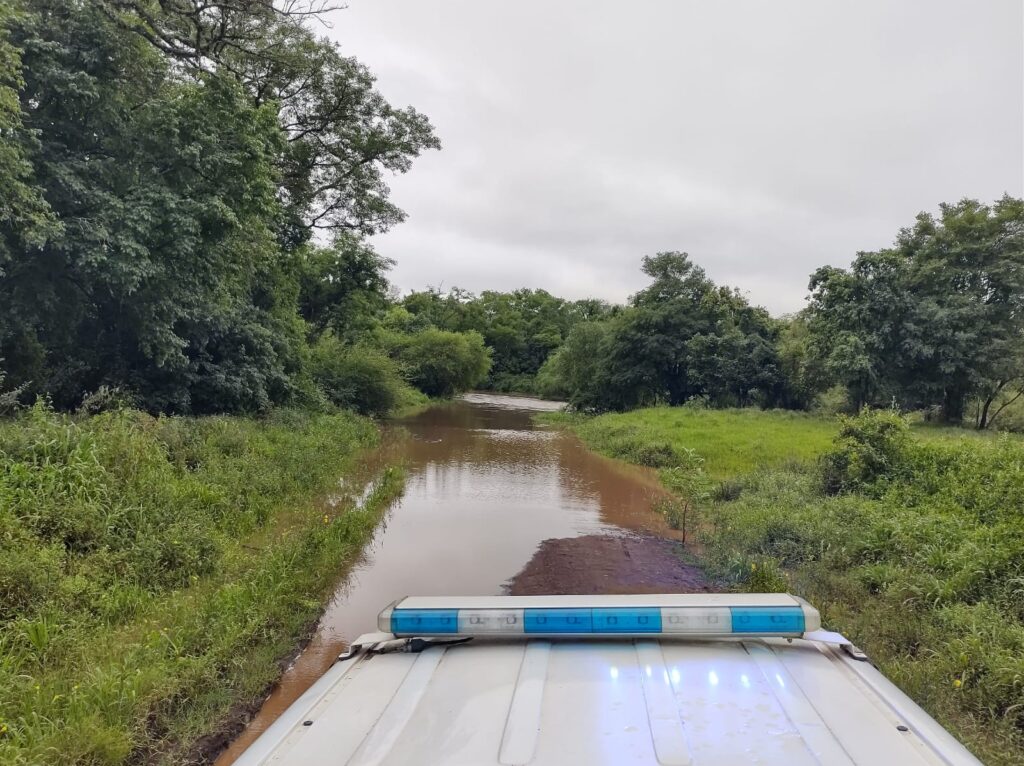 En horas de la tarde de este viernes, personal policial constató el desborde del arroyo Garupá sobre el puente del camino vecinal que une los parajes Tacuaruzú y Sol de Mayo, acceso a la comunidad aborigen Urunday-Ti.