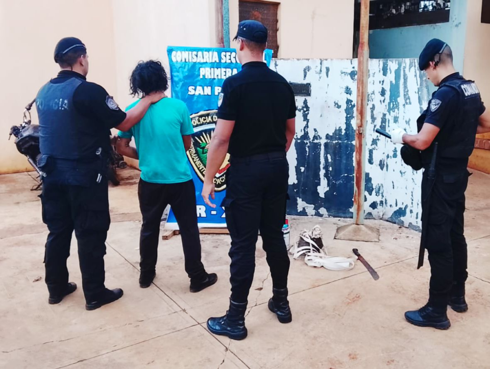 Un hombre de 28 años fue detenido en el barrio Santa Rosa de San Pedro tras protagonizar un violento episodio en el que amenazó a vecinos con un machete y terminó lesionando levemente a un efectivo policial que intervino en el procedimiento. El implicado fue reducido y quedó alojado en sede policial a disposición de la Justicia.