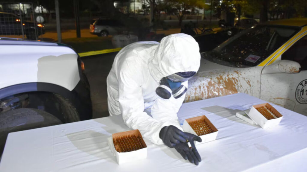 Personal de Criminalística de la fuerza procedió a la apertura de los bultos en presencia de testigos. El recuento arrojó un total de 300 ampollas de 2 miligramos cada una. Las pruebas químicas de orientación de campo confirmaron que la sustancia líquida era fentanilo.