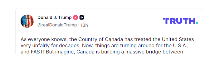 “No permitiré que este puente se abra hasta que Estados Unidos reciba una compensación por todo lo que les hemos dado, y también hasta que Canadá trate a Estados Unidos de una manera tan justa y equitativa como la que merecemos”, escribió el presidente estadounidense en un mensaje en su red Truth Social.