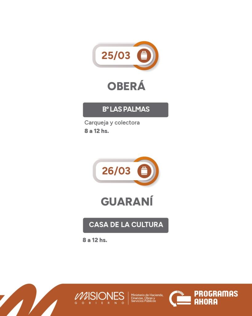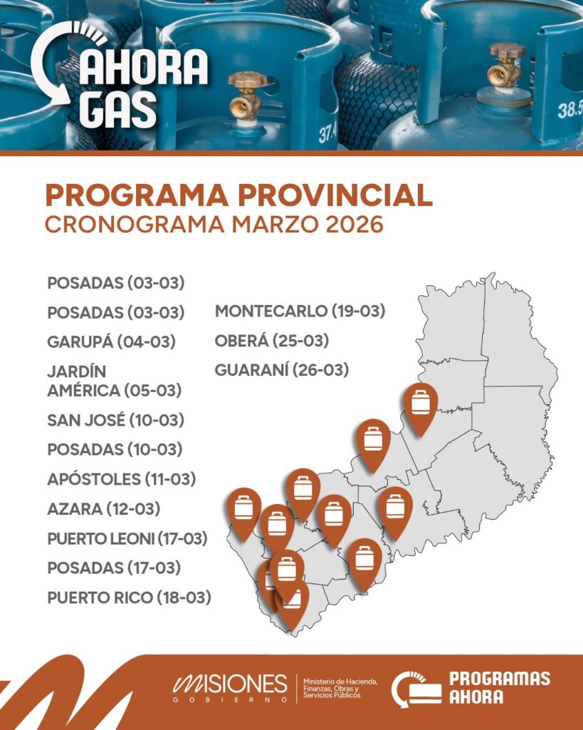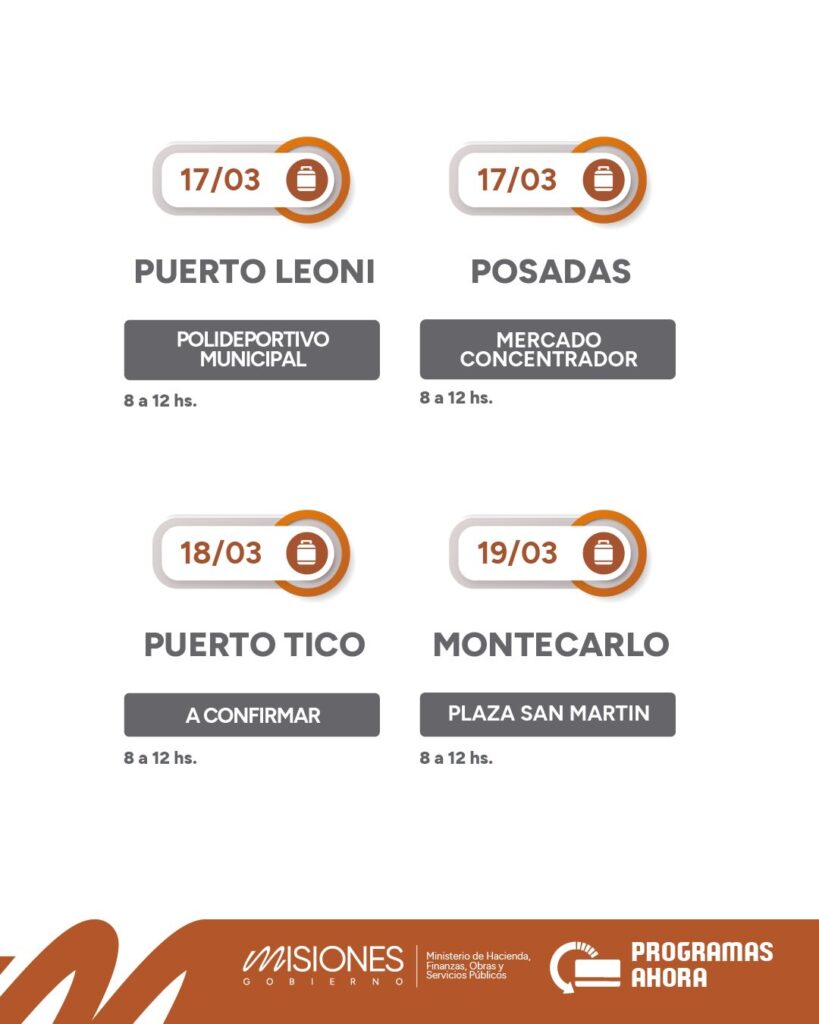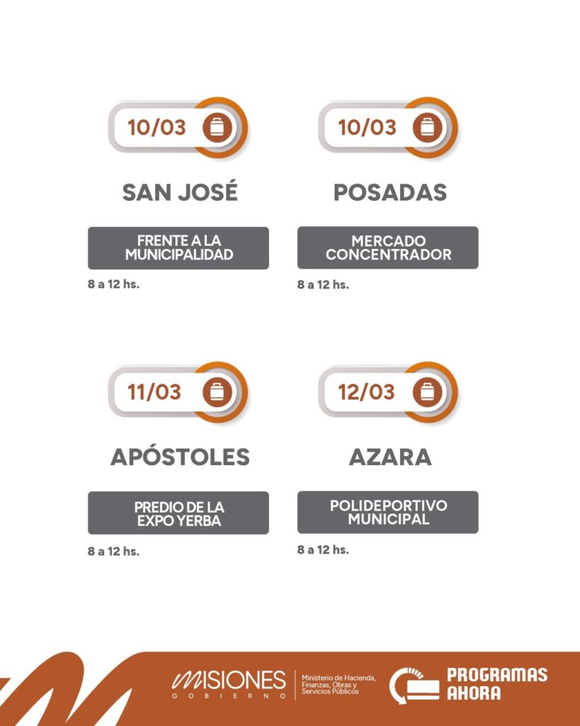 Durante marzo, el Ahora Gas recorrerá las localidades de Posadas (3/3); Garupá (4/3); Jardín América (5/3); San José (10/3); Posadas (10/3); Apóstoles (11/3); Azara (12/3); Puerto Leoni (17/3); Posadas (17/3); Puerto Rico (18/3); Montecarlo (19/3); Oberá (25/3) y Guaraní (26/3).