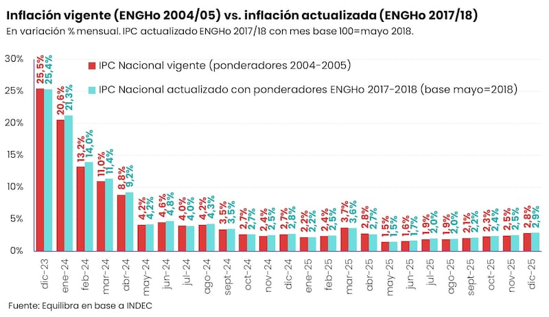 La inflación acumulada entre diciembre de 2023 y el mismo mes de 2025, los primeros dos años de Javier Milei como presidente, fue de 259%. Un informe de la Consultora Equilibra asegura que, con los nuevos ponderadores que recién se implementaron en enero de este año, ese número hubiera sido 270%, 11 puntos más.