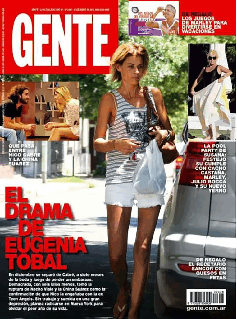 Segúnlas crónicas de la época, este episodio tuvo un fuerte impacto emocional en Tobal. En la tapa de la revista Gente que mostraron, bajo el título de “El drama de Eugenia Tobal” se describía a la actriz “demacrada, con seis kilos menos, tomó la ruptura de Nacho Viale y la China Suárez como la confirmación de que Nico la engañaba con la ex Teen Angels. Sin trabajo y sumida en una gran depresión, planea radicarse en Nueva York para olvidar el peor año de su vida”.