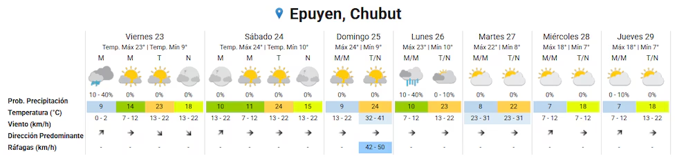 Desde el Servicio Meteorológico Nacional (SMN) indicaron que para la jornada de este viernes se espera una temperatura mínima de 9 °C por la madrugada, con la posibilidad de lluvias aisladas (entre un 10 % y un 40 %), que vienen desde el jueves. Sin embargo, hacia la tarde las nubes se irán y la máxima será de 23 °C, por encima del promedio en esta época del año para la región. De acuerdo con el sistema de alertas, para toda la zona cordillerana de Chubut rige una alerta por calor extremo en la región.