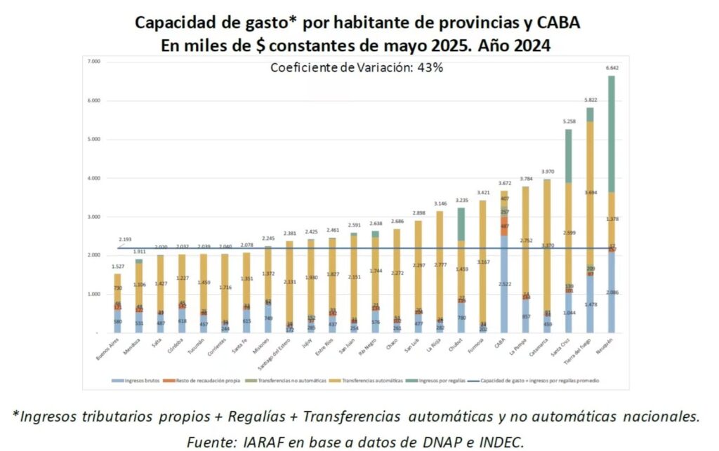 En un reciente informe del Instituto Argentino de Análisis Fiscal (IARAF), de autoría del economista Nadin Argañaraz, analiza en profundidad la distribución de los recursos federales en la Argentina y pone el foco en la capacidad de gasto por habitante derivada de las transferencias automáticas que la Nación envía a las provincias y a la Ciudad Autónoma de Buenos Aires.