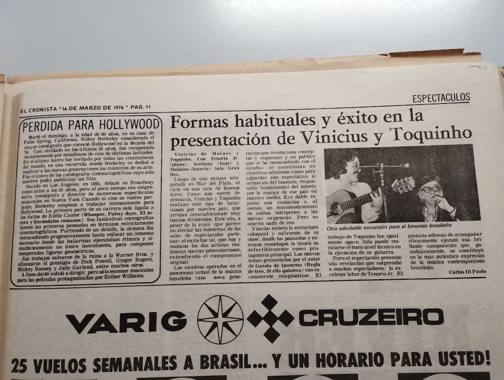 La cobertura en el diario El Cronista del 14 de marzo de 1976 con la presentación de Vinicius y Toquinho