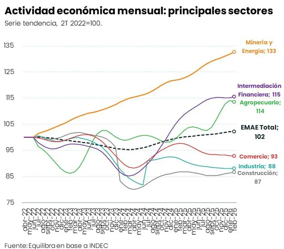 La crisis pegó y parió una novedad. Milei admitió, por primera vez, que hay problemas en la economía, que los “últimos meses fueron duros” y que “hay gente en los extremos de la distribución”, casi una autocrítica a la matriz del plan libertario, que muestra sectores que crecen sin generar empleo y otros, trabajo-intensivos, están a la baja, como lo muestra la consultora Equilibra: minería, intermediación financiera y agro, para arriba; Comercio, industria y Construcción, para abajo.