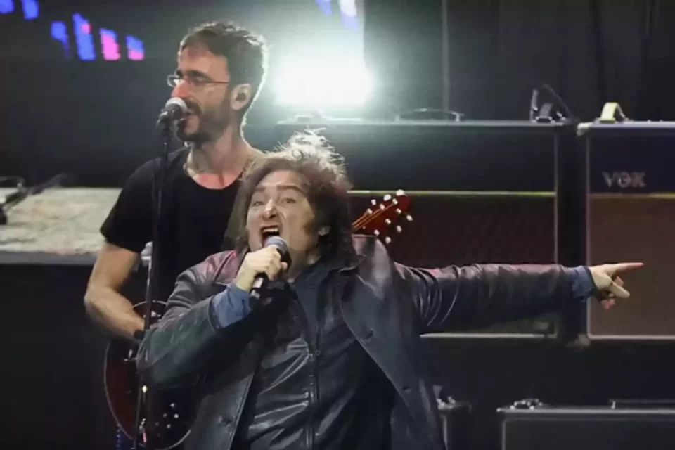 La militancia respondía con cánticos: "Saquen al pingüino del cajón para que vea que los pibes cambiaron de idea", pronunciaban. "Gracias a todos y en especial al triángulo de hierro que conforman Karina Milei y Santiago Caputo", respondió el Presidente y les agradeció a "los representantes de las alianzas y a las agrupaciones". Segundo sonó el Rock del Gato, de los Ratones Paranoicos y tercero el Blues del Equipaje, de La Mississippi. Entre tema y tema tomaba agua: "Necesito agua porque, aunque no parece, soy humano", bromeaba.