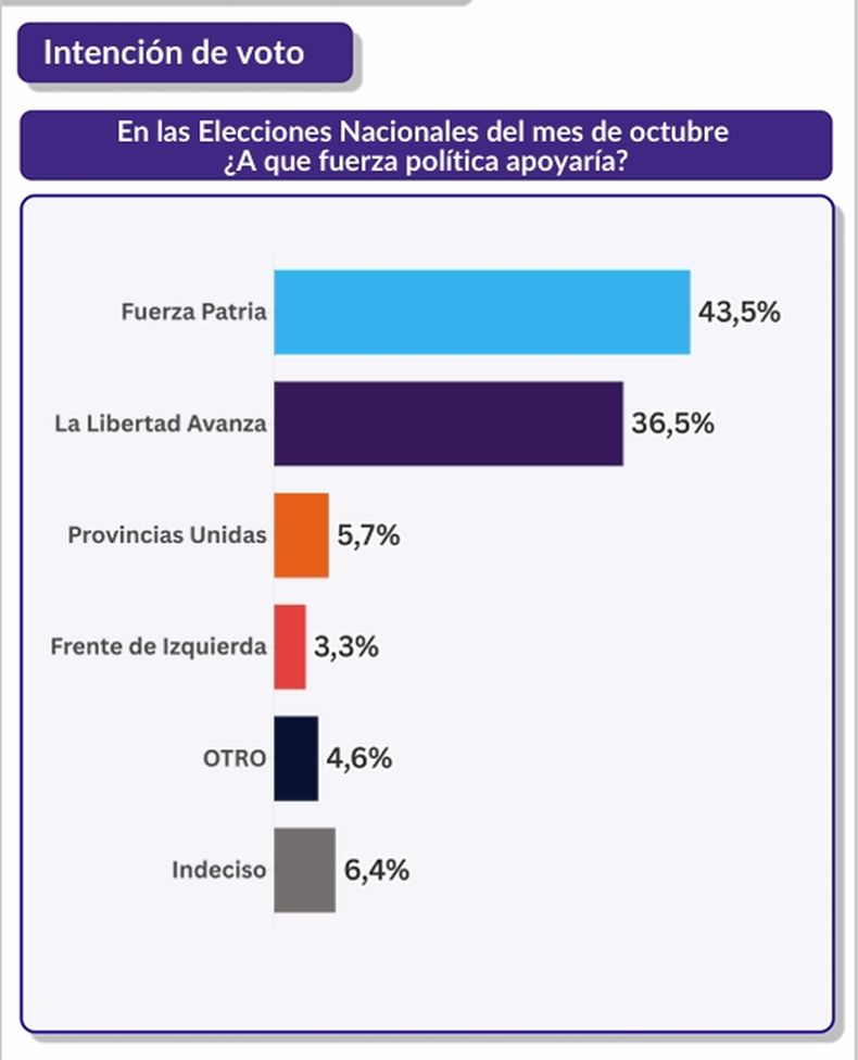 Fuerza Patria concentra la mayor preferencia entre el electorado, según los datos de la consultora. Si bien La Libertad Avanza mantiene un núcleo duro de respaldo, no logra expandirse hacia sectores moderados o independientes.