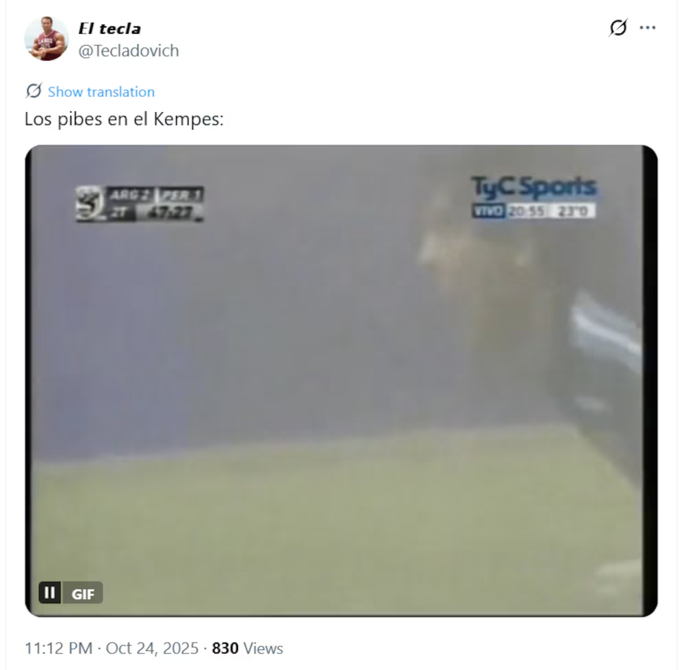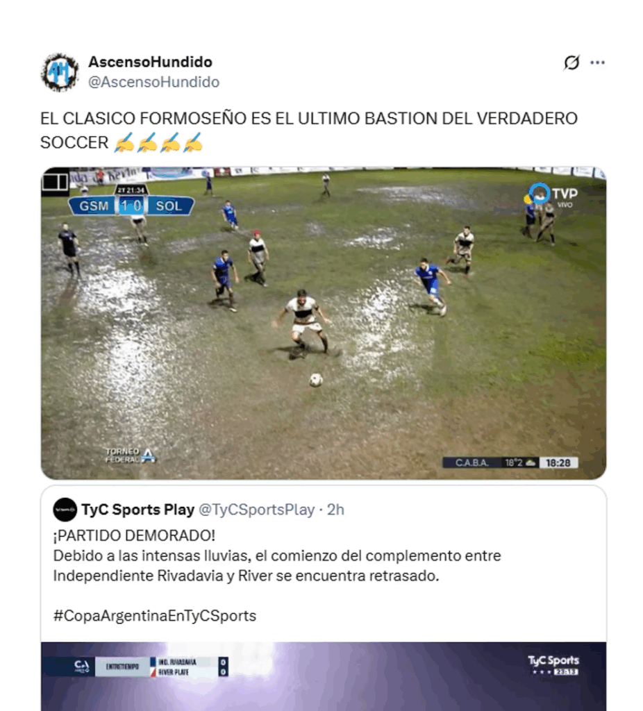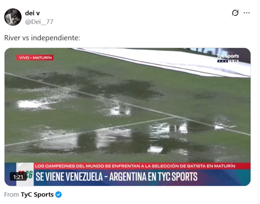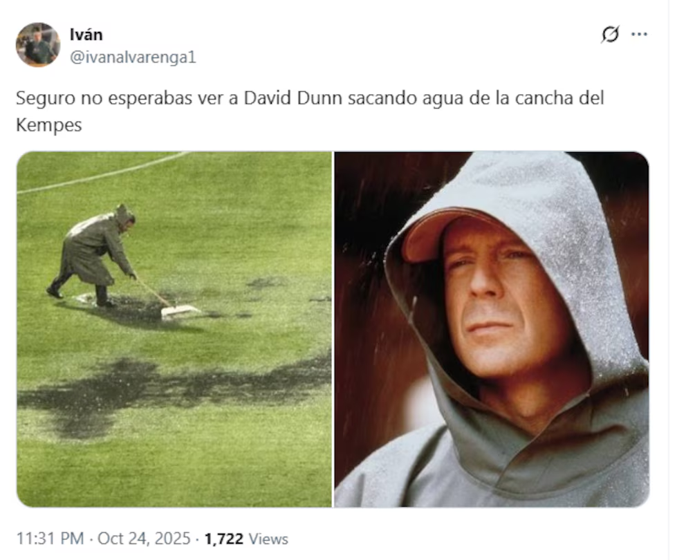 Aunque no fue el único tópico que se destacó, ya que el partido –que comenzó a las 22.15 del viernes– permaneció durante 45 minutos suspendido tras el final del primer tiempo por las intensas lluvias que cayeron en el Estadio Mario Alberto Kempes de Córdoba, generando múltiples bromas de los fanáticos que estaban siguiendo el partido a distancia