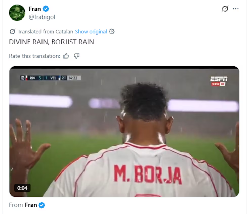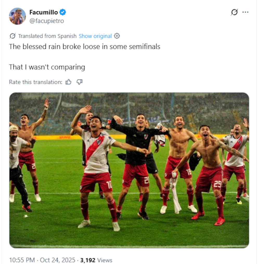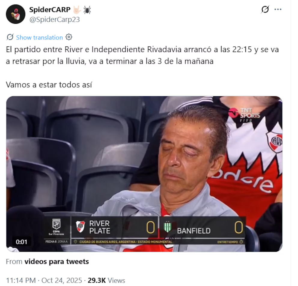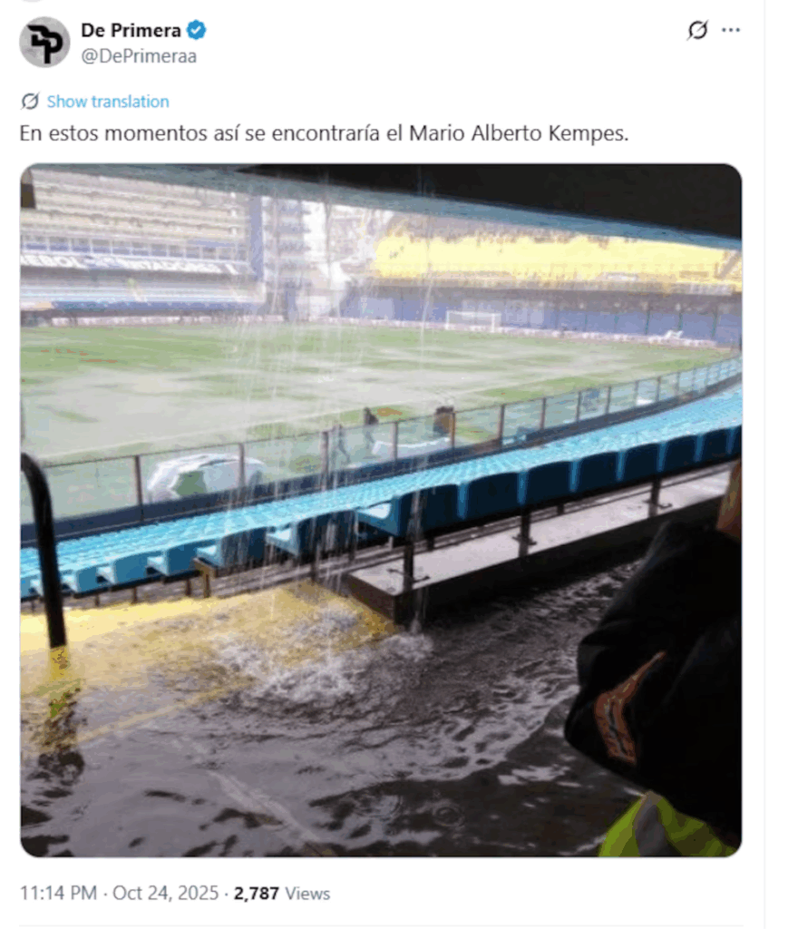 Aunque no fue el único tópico que se destacó, ya que el partido –que comenzó a las 22.15 del viernes– permaneció durante 45 minutos suspendido tras el final del primer tiempo por las intensas lluvias que cayeron en el Estadio Mario Alberto Kempes de Córdoba, generando múltiples bromas de los fanáticos que estaban siguiendo el partido a distancia