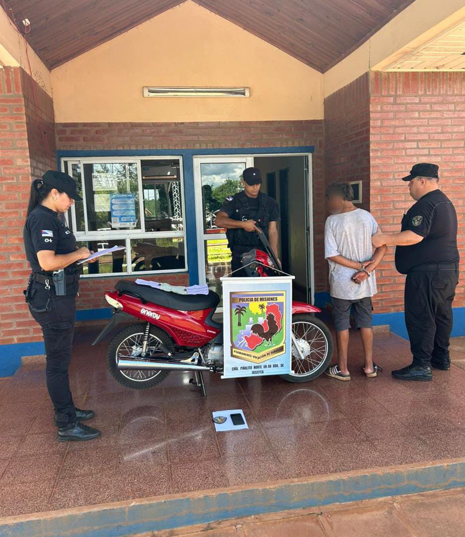 Lo insólito del caso se produjo poco después, cuando personal de la Comisaría Piñalito Norte, durante recorridas preventivas por el Paraje kilómetro 130, aprehendió a un joven de 22 años que circulaba utilizando la motocicleta robada y tenía en su poder el teléfono celular sustraído, lo que permitió esclarecer el hecho en forma inmediata.