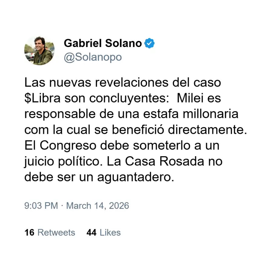 Gabriel Solano y el caso $Libra: “El Congreso debe someter a Milei a juicio político”