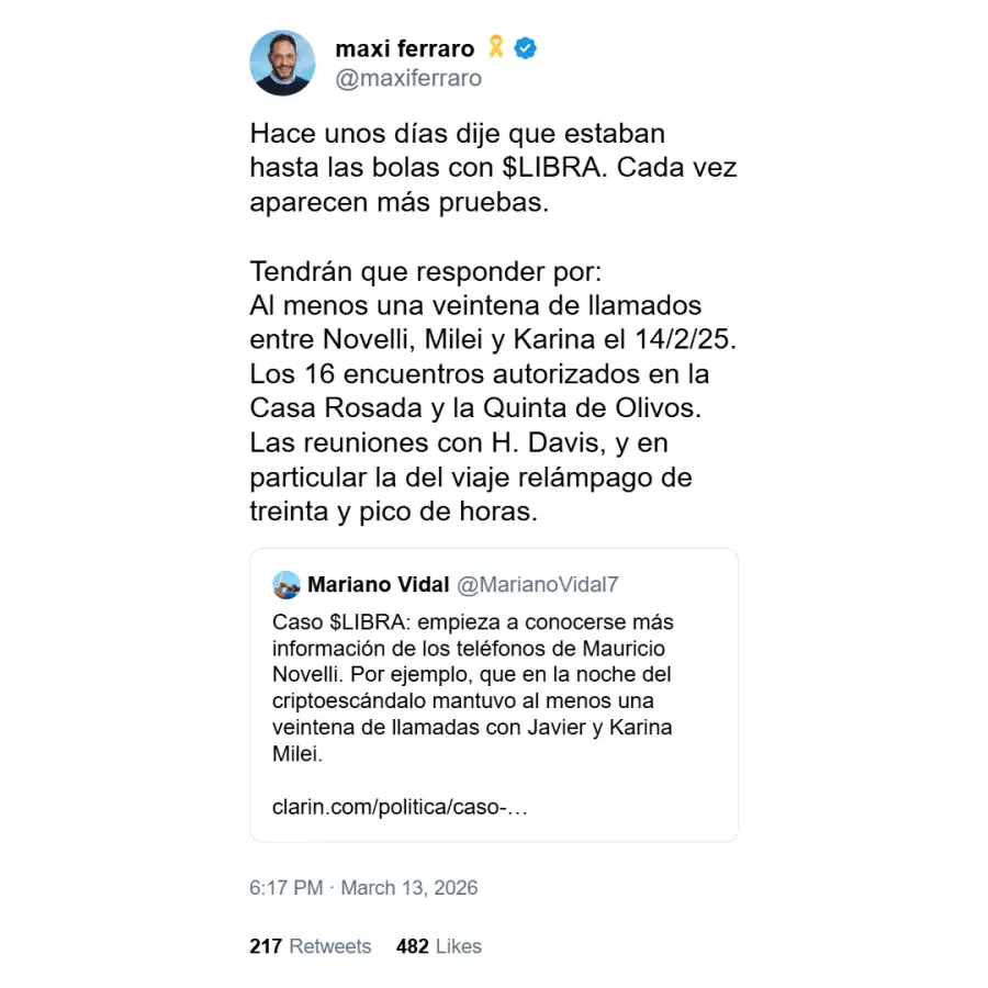 El diputado Maximiliano Ferraro dio más detalles sobre lo ocurrido: “Hace unos días dije que estaban hasta las bolas con $LIBRA. Cada vez aparecen más pruebas. Tendrán que responder por al menos una veintena de llamados entre Novelli, Milei y Karina el 14/2/25. Los 16 encuentros autorizados en la Casa Rosada y la Quinta de Olivos. Las reuniones con H. Davis, y en particular la del viaje relámpago de treinta y pico de horas”.