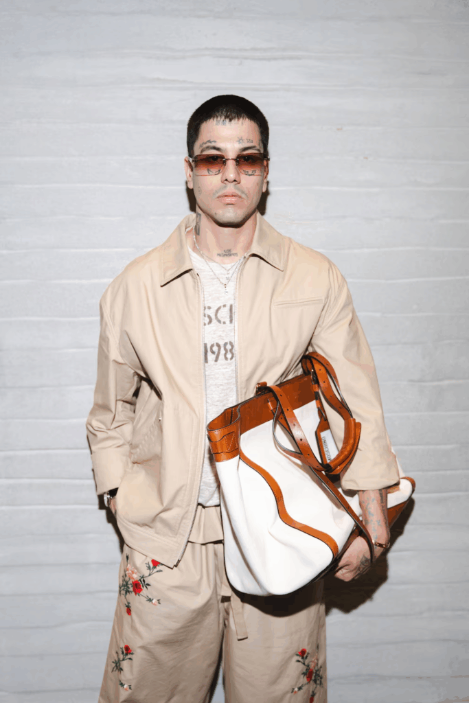 El artista Duki posa con un conjunto beige bordado y un bolso Moschino durante la Semana de la Moda de Milán, reafirmando su presencia en el mundo de la moda