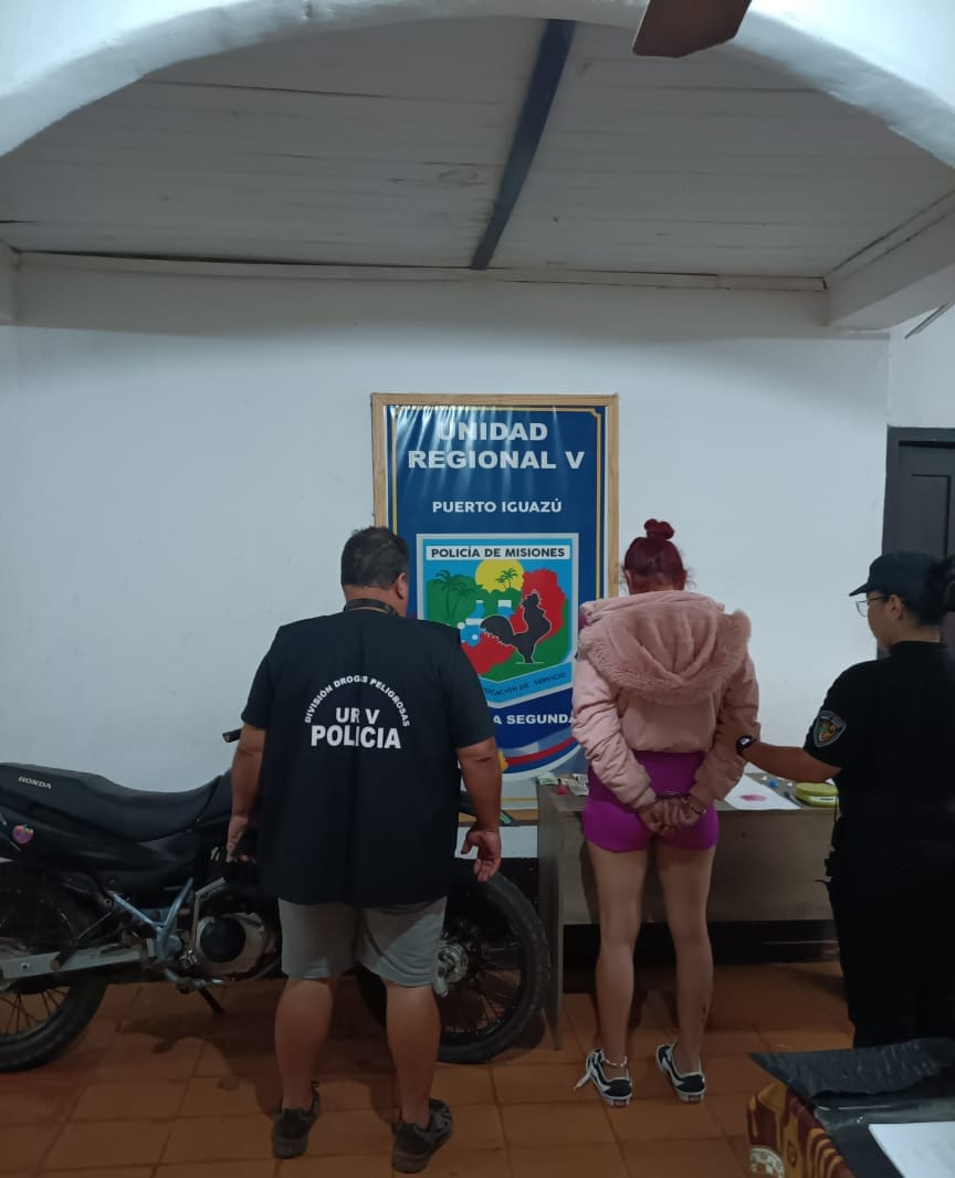 Una mujer de 35 años fue detenida en Puerto Iguazú tras ser interceptada durante un operativo nocturno de prevención, cuando circulaba en una motocicleta y se negó a exhibir la documentación. En su poder llevaba cocaína fraccionada, marihuana y dinero en efectivo en distintas monedas, elementos que fueron secuestrados por la Policía.