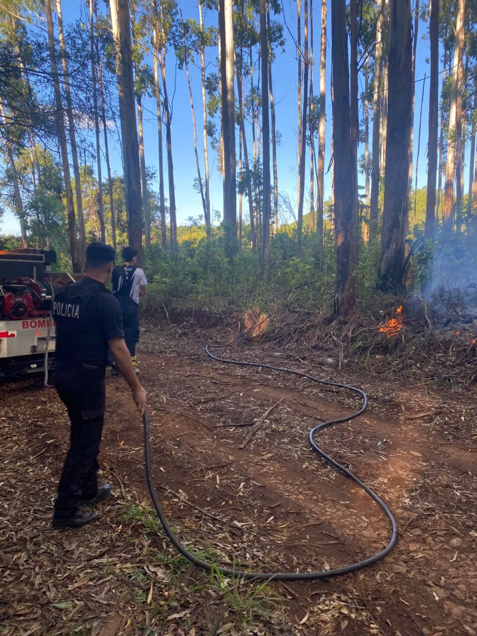 Un incendio de malezas se registró hoy a las 17:40 en la RP 13, a la altura del kilómetro 6, en jurisdicción de San Vicente, tras la caída de un cable de alta tensión que provocó el foco ígneo en un eucaliptal.