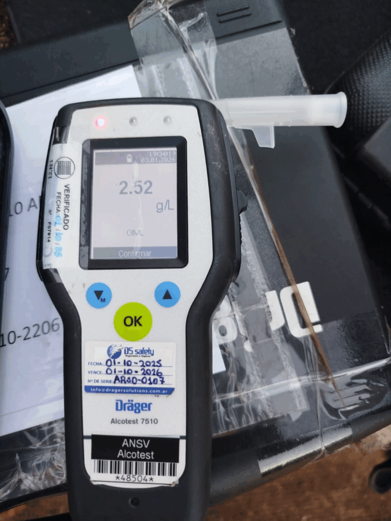 Asimismo, se constató que al momento de su aprehensión circulaba a bordo de un vehículo Volkswagen Gol, presentando signos evidentes de ebriedad. Personal de la Dirección de Tránsito Municipal realizó el test de alcoholemia, el cual arrojó resultado positivo de 2,52 g/l, procediéndose a la retención del rodado, que fue trasladado al corralón municipal.