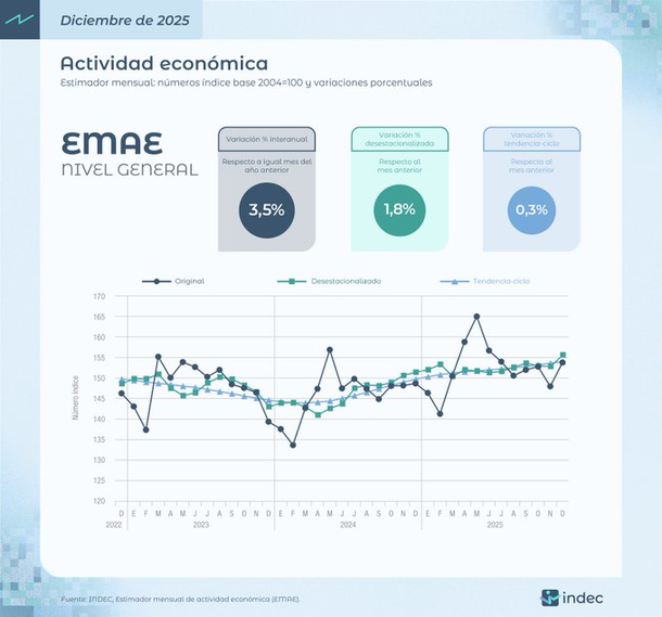La economía argentina terminó 2025 con un desempeño positivo según los últimos datos del Instituto Nacional de Estadística y Censos (INDEC). El Estimador Mensual de Actividad Económica (EMAE) registró un incremento de 3,5% en diciembre respecto al mismo mes del año anterior, mientras que en el acumulado anual, la actividad económica cerró con un crecimiento de 4,4% interanual, reflejando una recuperación que no fue uniforme entre los distintos sectores productivos y de servicios del país.