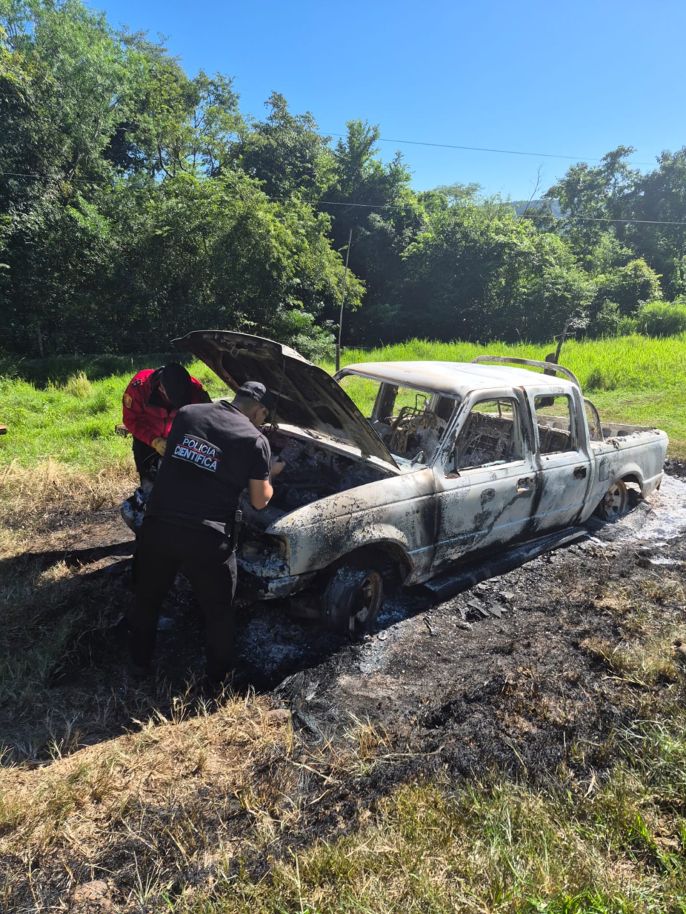 Al regresar a su vivienda, ubicada a unos 15 kilómetros del casco urbano, el damnificado encontró su camioneta Ford Ranger completamente envuelta en llamas dentro de su propiedad, sin poder sofocar el incendio, lo que derivó en la destrucción total del vehículo.