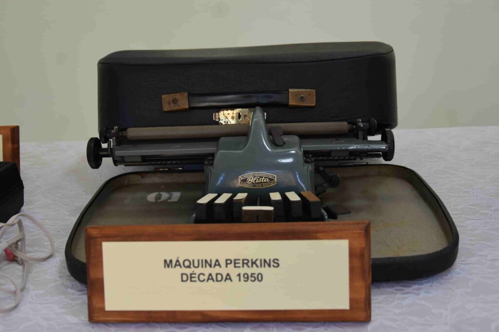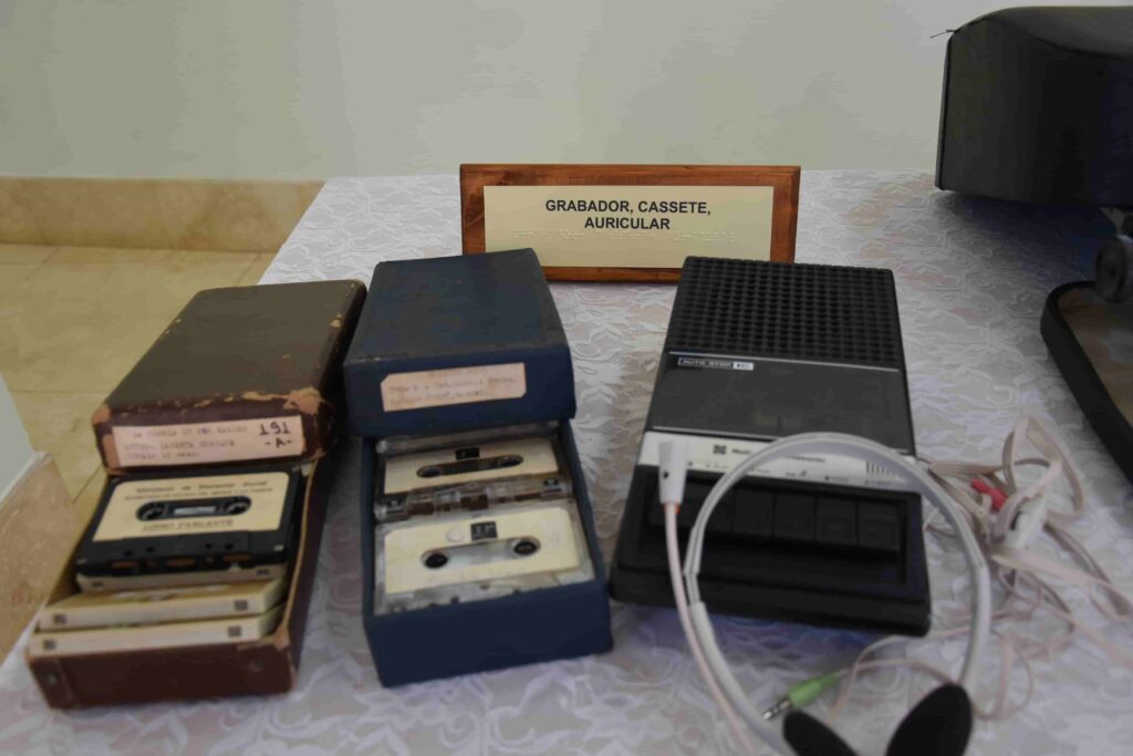 La muestra incluye máquinas de escribir, libros y materiales didácticos utilizados en la enseñanza del sistema Braille, tanto para adultos como para niños, y pone en valor el trabajo sostenido de la comunidad educativa dedicada a la accesibilidad y la inclusión en Misiones.