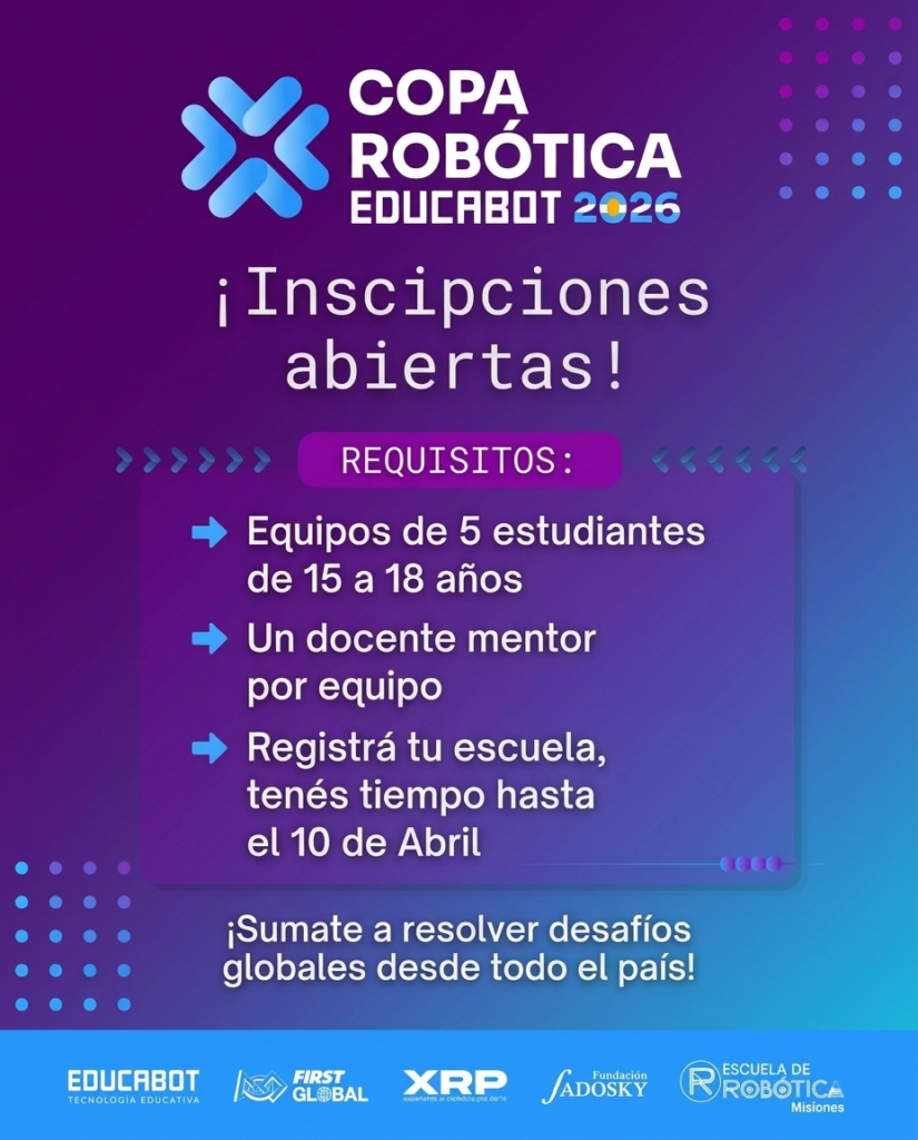 La Escuela de Robótica de Misiones invita a instituciones educativas de toda la provincia a participar de la Copa Robótica EDUCABOT 2026, una propuesta innovadora que promueve el aprendizaje tecnológico, el trabajo en equipo y el desarrollo de habilidades del siglo XXI en estudiantes de nivel secundario.