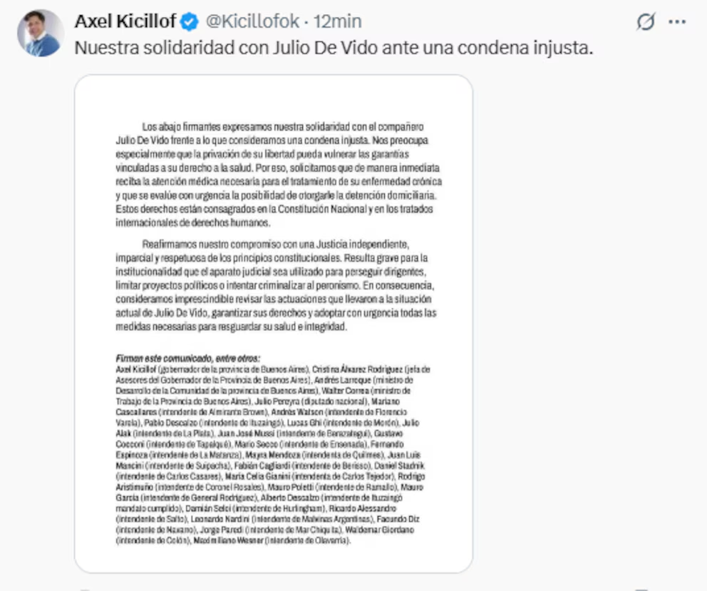 El primero en compartir el comunicado fue el gobernador Axel Kicillof. En el texto se expresó: “nuestra solidaridad con el compañero Julio De Vido frente a lo que consideramos una condena injusta. Nos preocupa especialmente que la privación de su libertad pueda vulnerar las garantías vinculadas a su derecho a la salud”.